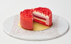 タイベリーのジュレと、バラのムースを重ねた、華やかでほどよい酸味を感じる層に、